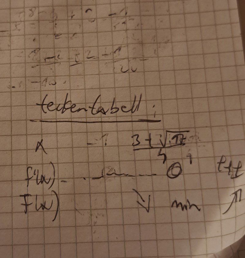 Jag ändrade med min teckentabell nu och fokuserar på att undersöka bara den positiva derivata nollställe. Vänta är min derivering fel eller vadå? Varför får vi så olika? Jag deriverade en term var för sig.