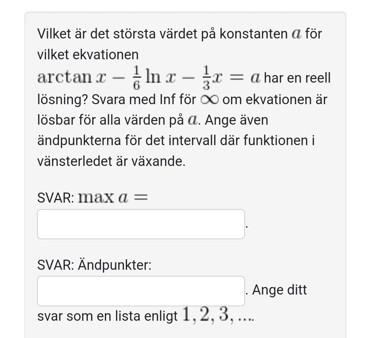 PATENTERAMERA skrev:Värdemängden för funktionen f(x) i VL av ekvationen i problemet är (-). Det betyder att det finns åtminstone en lösning till ekvationen för varje värde a. Så rätt svar på första frågan borde vara att max a = inf, såsom man definierar det enligt problemtexten.