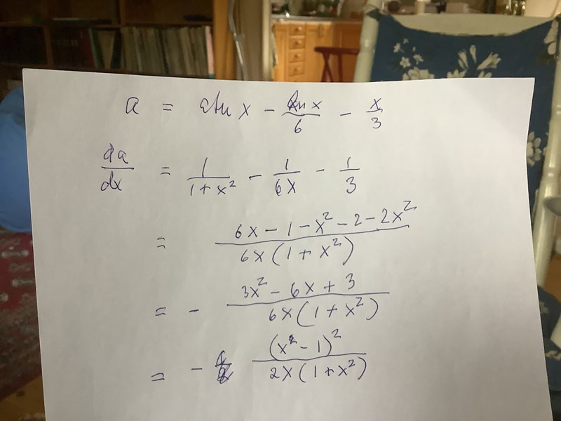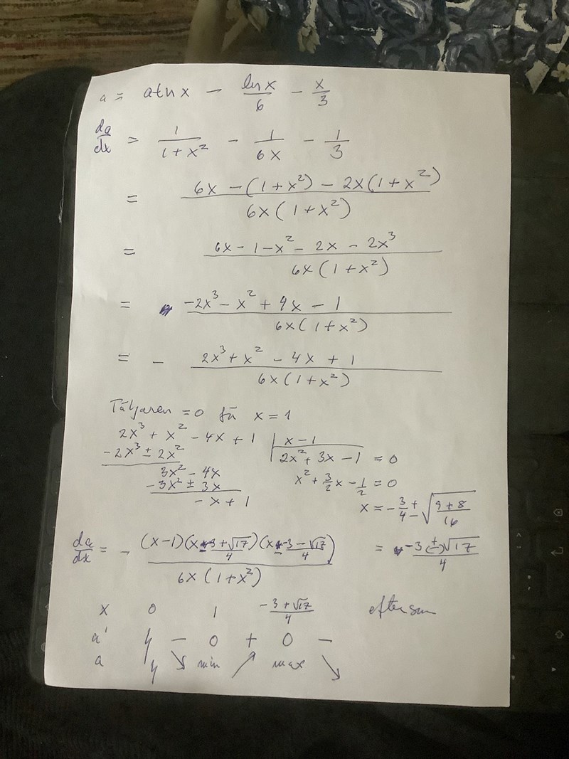 Jag får da/dx = – (x–1)2 / [2x(1+x2)]