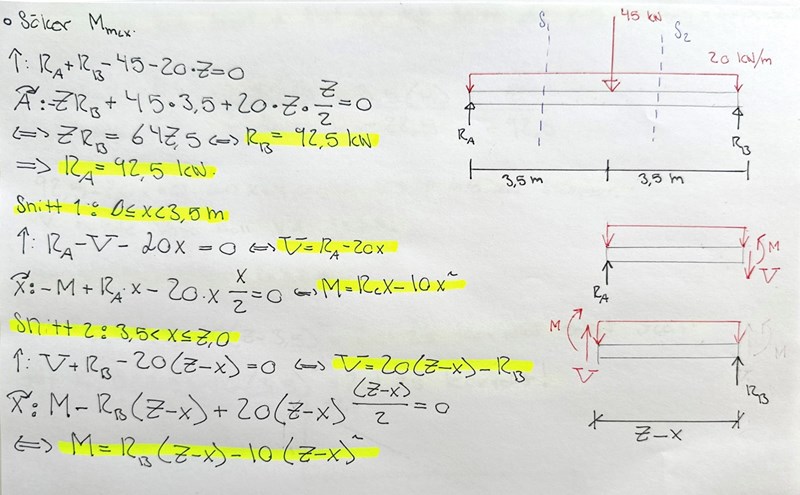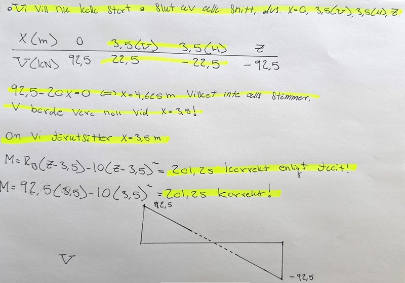 MMax är korrekt enligt facit för uppgiften, och jag kan intuitivt förstå att V = 0 för 3,5 m, dvs L/2. Problemet är att jag inte kan hitta en analytisk formulering för detta. Hur kan jag fixa det? Borde jag snitta på annat sätt, ställa upp en annan ekvation? Tack så mycket!