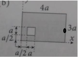 Så här skulle jag tänka: Om det inte hade varit för det lilla kvadratiska hålet, skulle tyngdpunkten ha legat precis i mitten av den stora rektangeln. Nu kan vi tänka oss systemet som en punktmassa i mitten av rektangeln, och en "negativ punktmassa" i mitten av kvadraten. Beräkna tyngdpunkten för detta system.