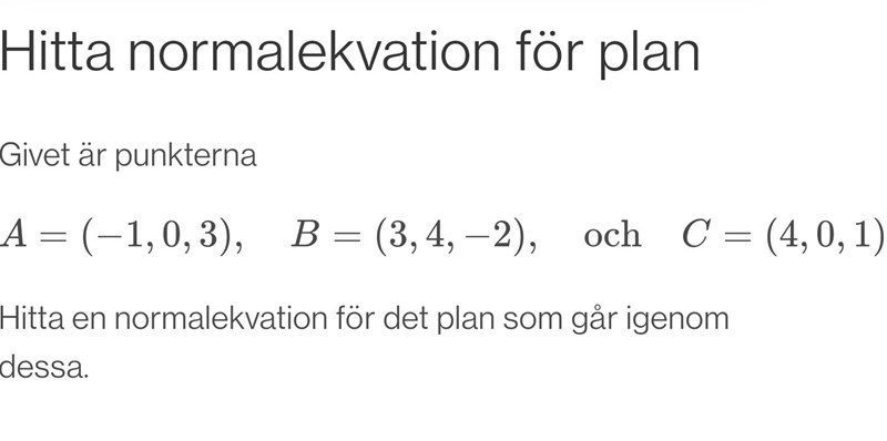 Smutstvätt skrev:Det låter vettigt. Ett plan med normalvektorn har ekvationen . För att bestämma d sätter vi in en punkt i , så får vi ut d. :)