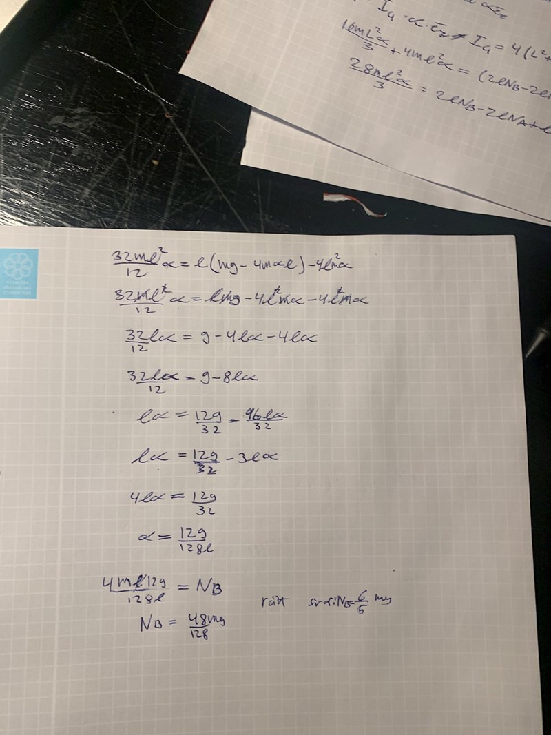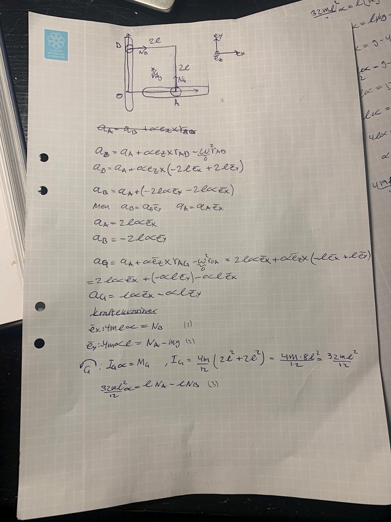 Ditt masströghetsmoment är inkorrekt. Jag kan inte riktigt se hur du har tänkt mer än att det är fel. I övrigt ser det bra ut, du har ett korrekt uttryck för normalkraften i B (). Det som blir fel är vinkelaccelerationen i och med att tröghetsmomentet är fel.