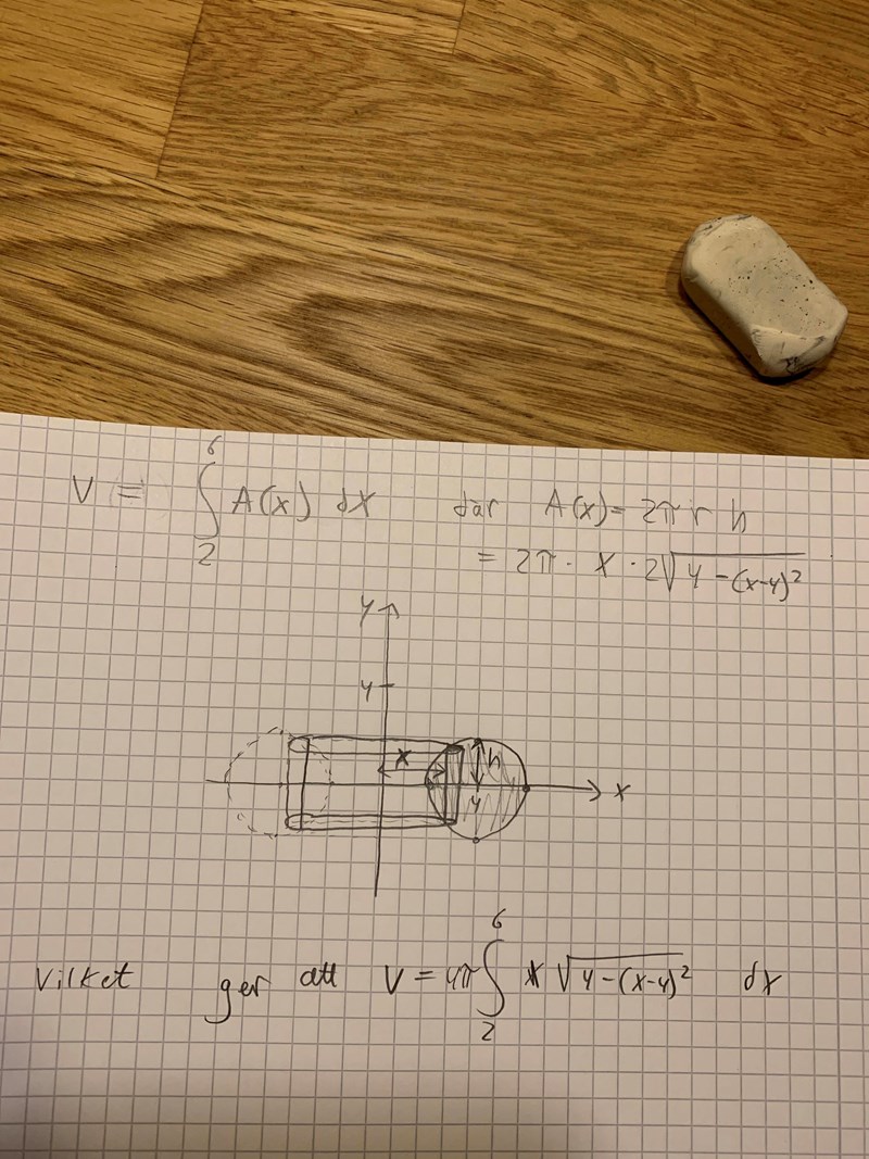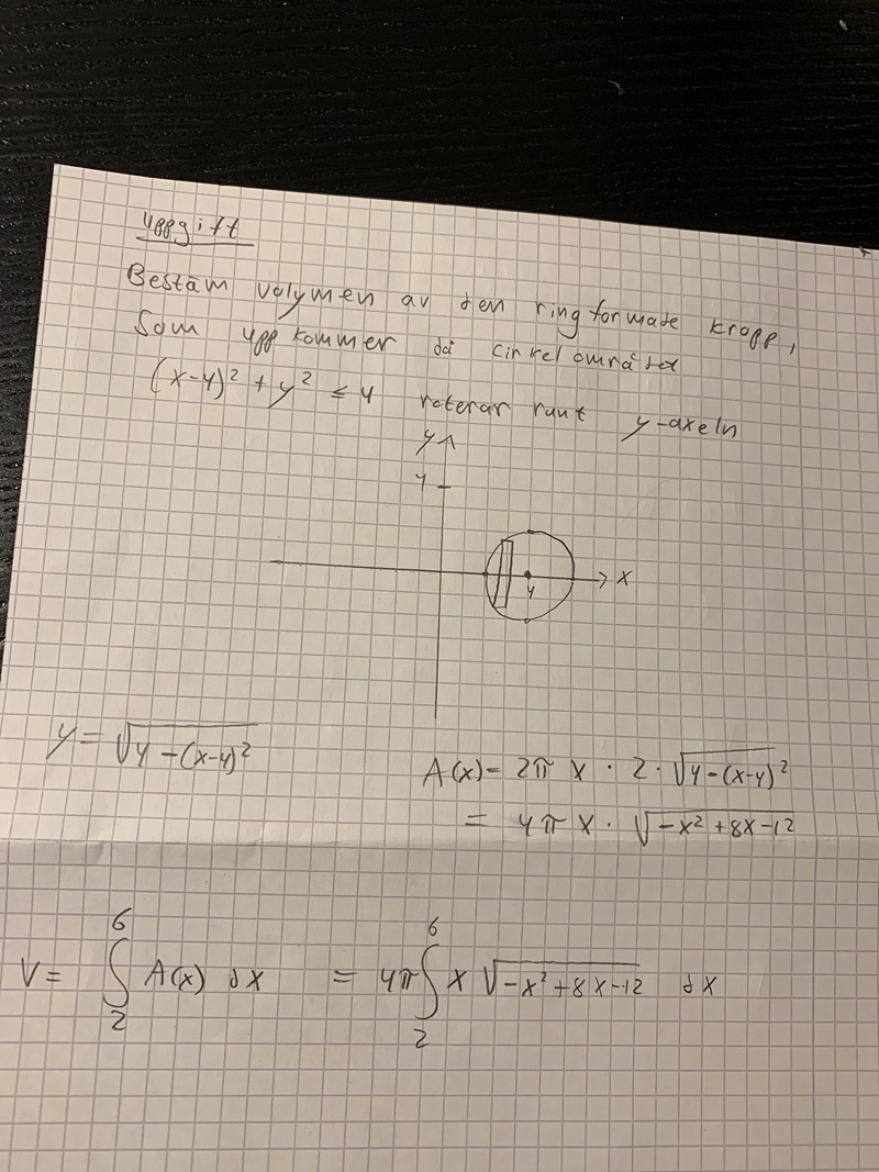 Smaragdalena skrev:Bra att du la upp ursprungsfrågan! Integralen du har skrivit upp har nämligen inte mycket att göra med uppgiften du skall beräkna. Börja med att rita en bättre bild, där man kan se hur den ringformade kroppen ser ut. Jag tror att du tänker dig att omrädet skall rotera kringx-axeln, men det står y-axeln i uppgiften. Om den lilla cirkeln roterar kring x-axeln blir det ett klot, och det är inte ringformat.