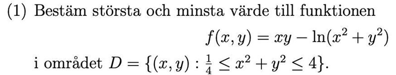Nu över till en annan fråga: När jag försöker hitta max resp. min för området innanför randerna så deriverar jag med avseende på vardera variabel och får . Hur räknar jag ut när båda är 0?