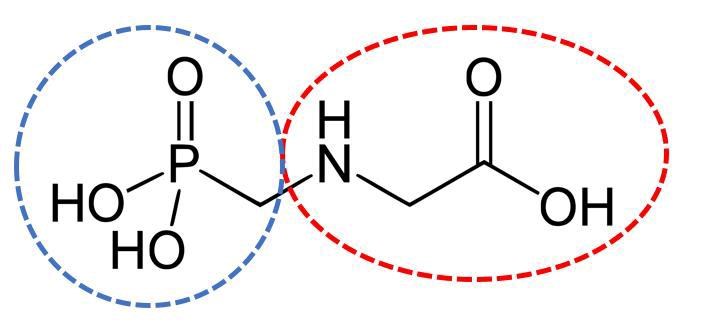 Okej, molekylen består av en fosfonometyl grupp (blå ringen) och aminosyran glycin (röda elipsen). Så ett av namnen för ämnet är fosfono metylglycin.