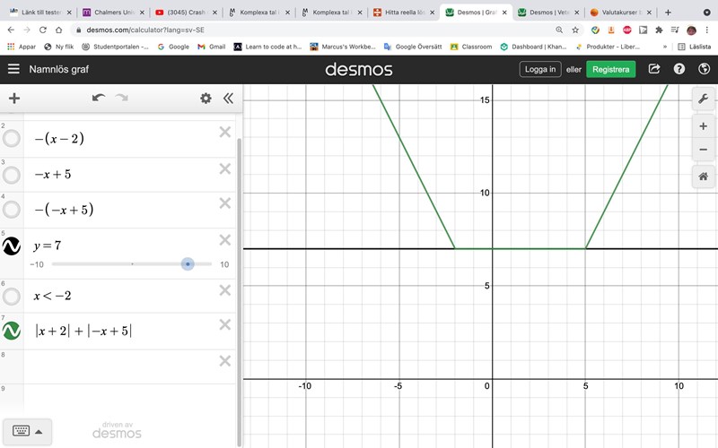 Summan av den blåa och den röda grafens höjd motsvarar alltså värdet av |-x+5| + |x+2|.