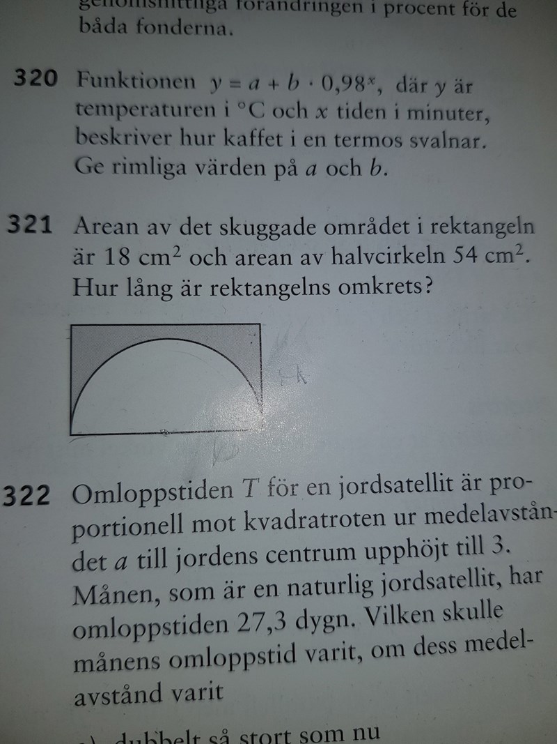 Rektangelns totala area är vilket innebär att halvcirkelns diameter, som vi kan kalla a, multiplicerat med rektangelns höjd, b, ska bli 72.