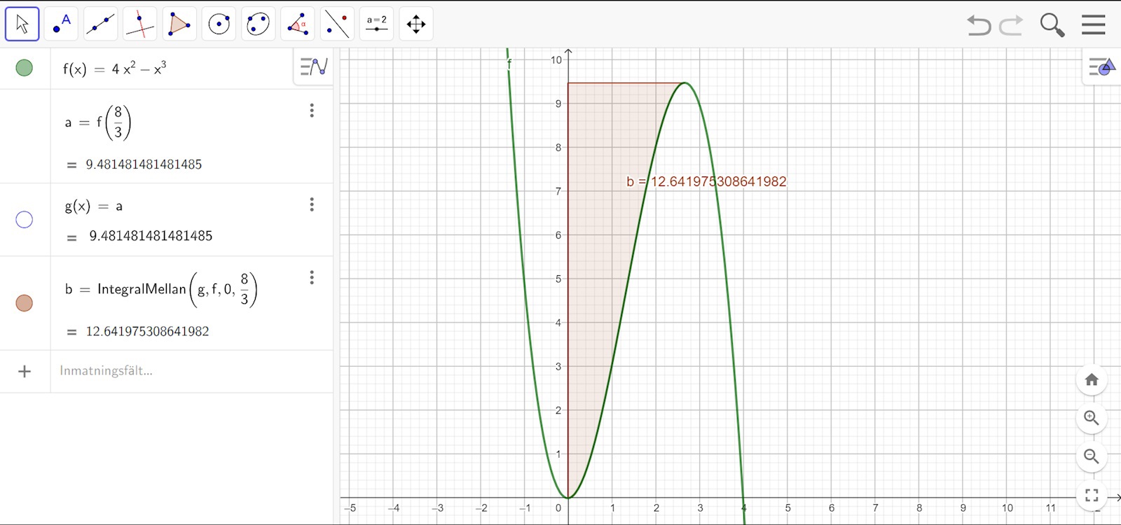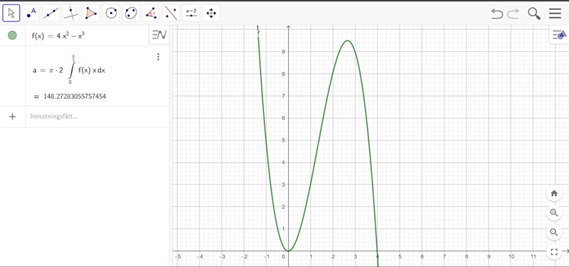 Hej, jag undrar om det går att använda GeoGebra för att hitta (numeriskt värde formodligen på) rotationsvolymen runt y-axeln på funktionen där det vanligtvis inte går att lösa ut x, till exempel funktionen 4x^2-x^3.