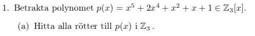 Min första tanke var att utföra polynomdivision men då jag inte hittar något uttryck att dela med så har jag fastnat, det vill säga det finns inget heltal x sådan att p(x) = 0. Gör man på ett annat sätt när man ska hitta rötterna i Z3? All hjälp uppskattas, tack på förhand!