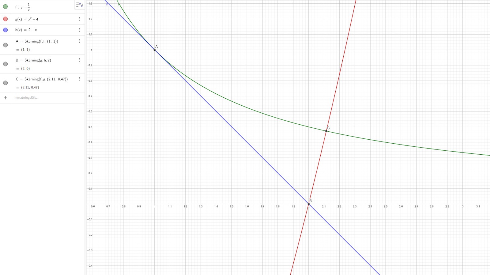 Edit: Såg bilden blev lite otydlig. Men skärningspunkten vid C är X=2,11