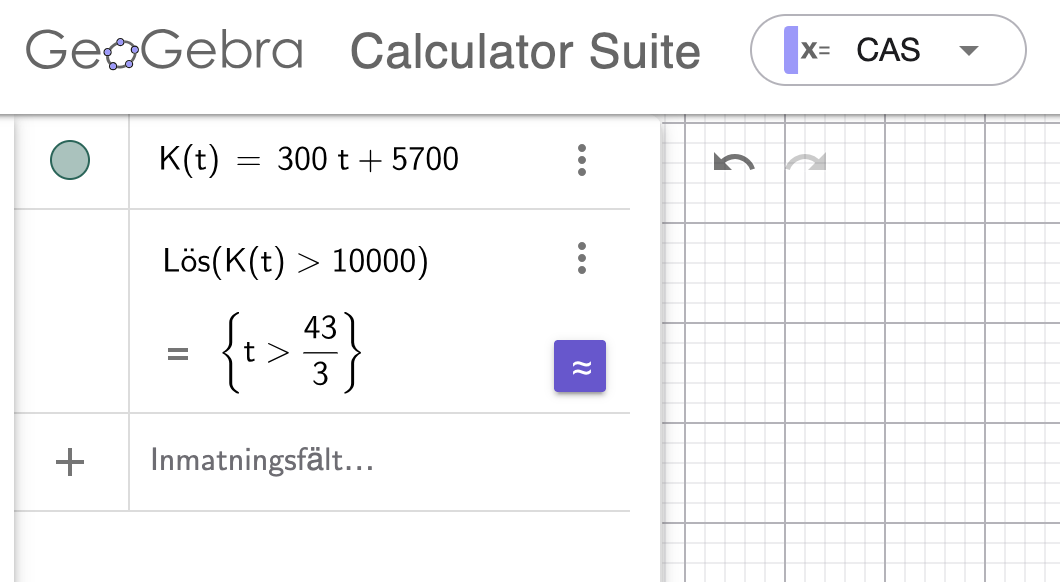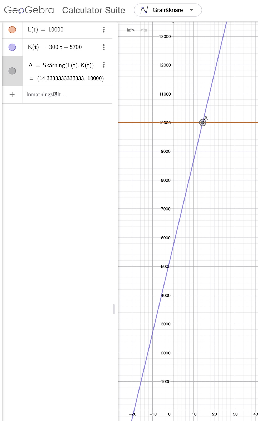 Jag skulle försöka lösa en uppgift i geogebra, uppgiften i sig är väldigt enkel, det är någon som säter in pengar på ett konto och lägger in 300 kr/månad (de räknar inte md ränta i denna uppgift) men de vill veta när personen för första gången har mer än 10000 på kontot. Här är hur jag löste det i geogebra. Men jag vet inte riktigt hur jag ska göra för att hitta skärningspunkten för x här (t). I detta fall antar jag att det istället för att stå x=.... så ska det skrivas x>..... Jag vill veta skärningspunkten, men hur gör jag för att veta var den punkten är i detta fall då det inte riktigt är 2 grafer som skär i varandra?