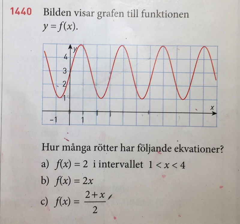 När jag ritar upp 2+x/2 (1+0,5x) kan jag bara hitta 2 st skärningspunkter i intervallet men facit säger att det ska finnas fem, hur har jag tänkt fel?