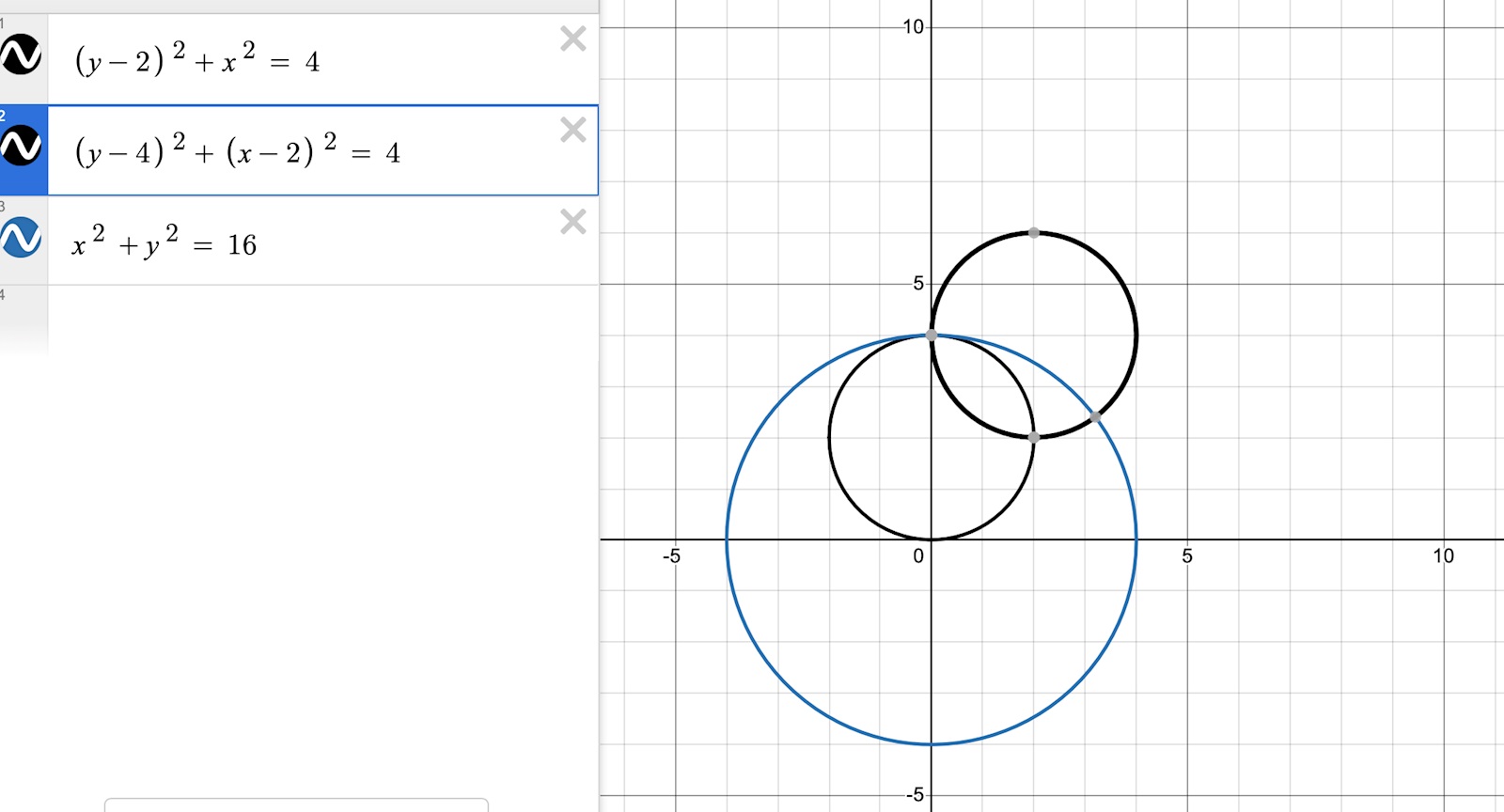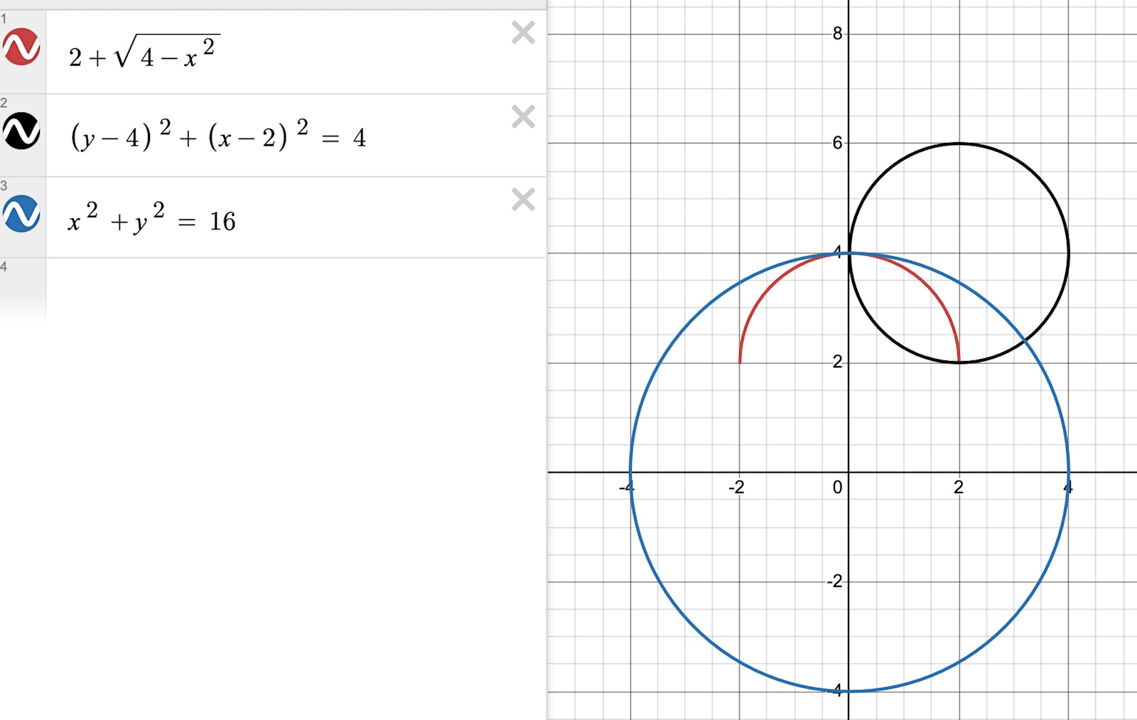 Den övre halvcirkeln definieras väl av ekvationen (y-4)2+(x-2)2=4(y-4)^2+(x-2)^2 = 4 genom att kolla i figuren och kvartscirkeln borde väl definieras av x2+y2=16x^2+y^2=16?