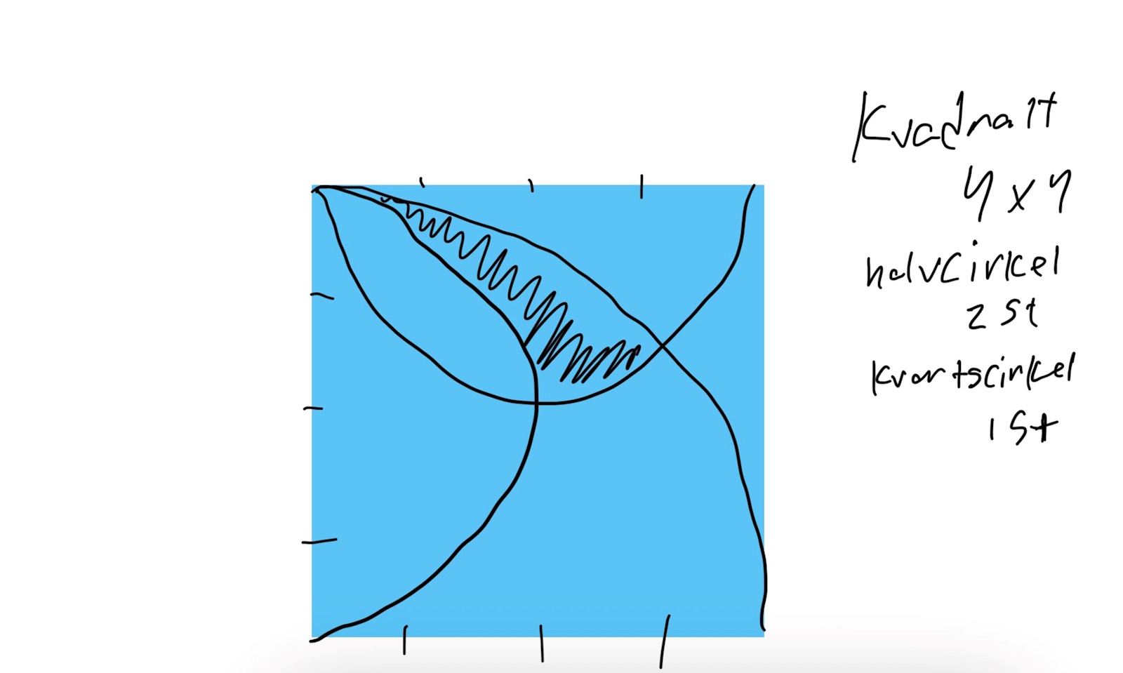 Vi har en kvadrat på 4x4 längdenheter. Från övre vänstra hörnet till övre högra hörnet går en halvcirkel. Likaså går en halvcirkel från övre vänstra till nedre vänstra hörnet. Slutligen går en kvartscirkel från övre vänstra till nedre högra hörnet. Bestäm arean av det område som avgränsas av dessa halv/kvarts-cirklar.