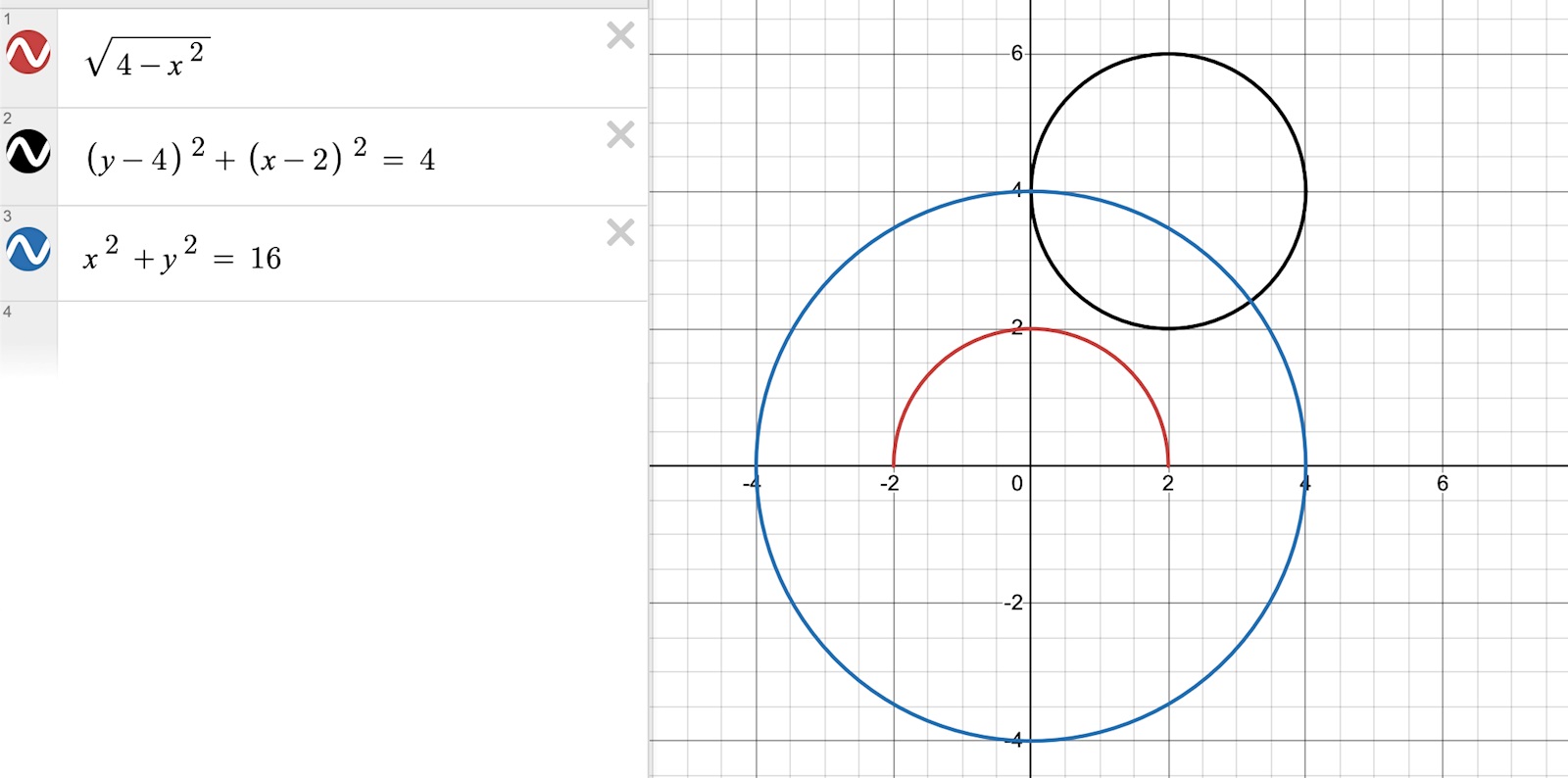 Om du löser ut yy i ekvationen (y-4)2+(x-2)2=4(y-4)^2+(x-2)^2=4 får du två lösningar, eller hur? En lösning definierar cirkelns övre halva, och en definierar cirkelns undre halva. Det är den undre halvan som är aktuell för oss.