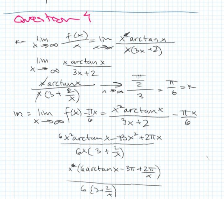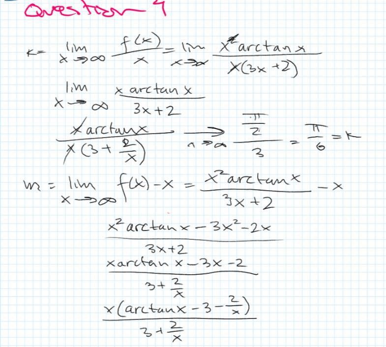 hej i min uppgift skall jag hitta de sneda apsymtoterna till f(x)=(x^2arctanx)/(3x+2) jag har börjar med det ena men jag får problem då jag skall hitta mitt m för ekvationen.