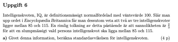 Berakna Z for 2/3 fran medelvardet (eller 1/3 fran medelvardet och ha i atanke att normalfordelningen ar symmetrisk). Svart att hitta i en tabell, men min dator sager att det ar Z = 0.968. Utifran defintitionen av Z kan du sedan berakna standardavvikelsen.