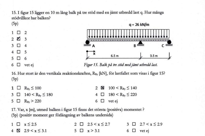 Har fastnat på fråga 17 vet inte hur jag ta tillväga där. Har löst fram reaktionskrafterna Ray= 68,6 kN, Rby=175,4 kN, Rcy= 16,03 kN.