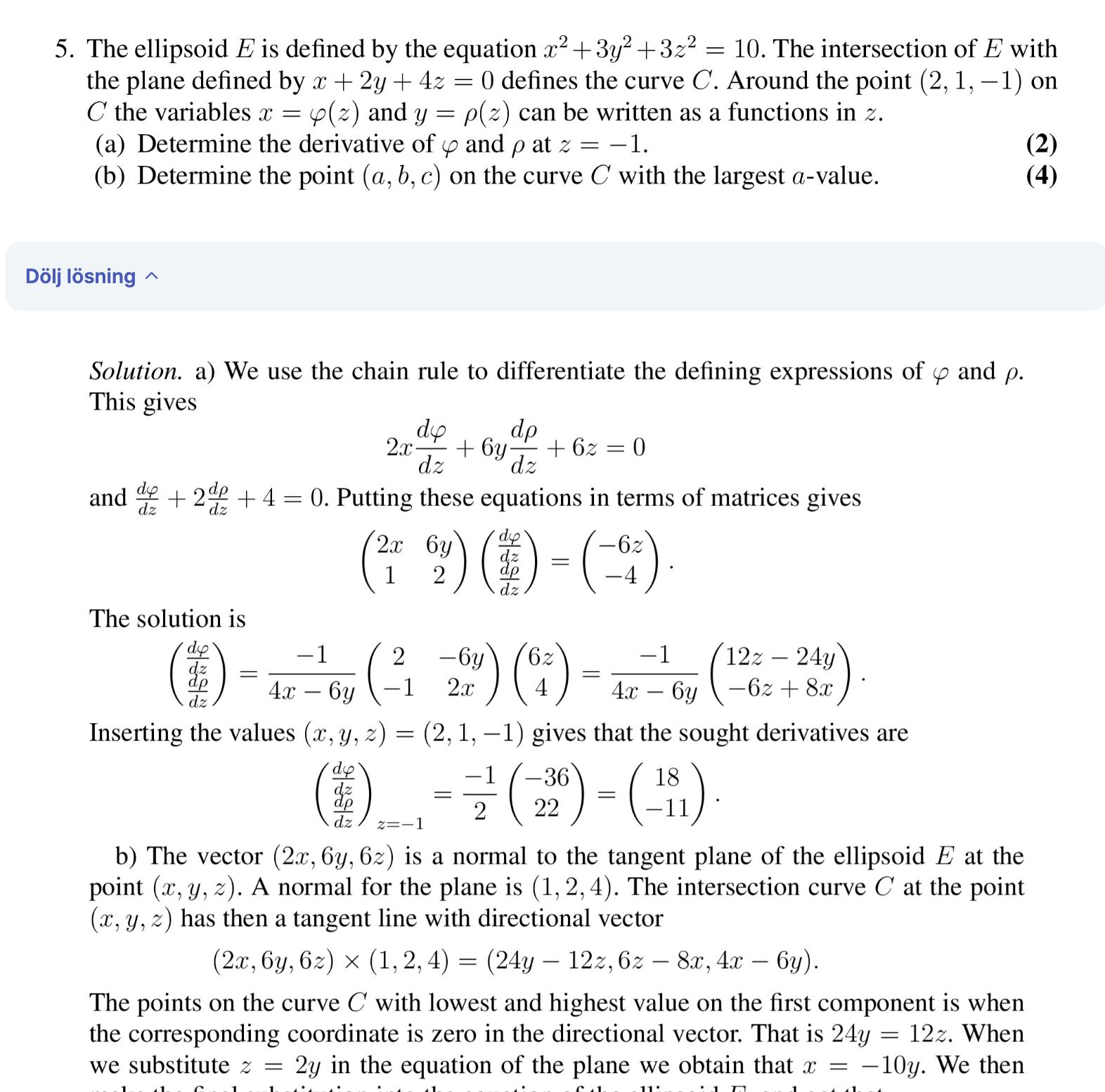 Hej! Jag vet inte riktigt hur jag ska tänka på b-uppgiften. Facit har jag också svårt att förstå. Hur vet jag att tangentvektorn är ortogonal mot planets och ellipsens normal? Hur vet jag hur jag ska använda den för att hitta största värdet på a?