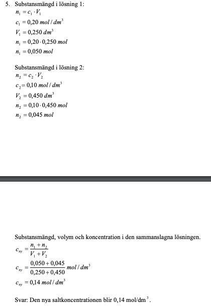 Man blandar 250 ml av en natriumkloridlösning med (2p) koncentrationen 0,20 mol/dm 3 med 450 ml av en natriumkloridlösning med koncentrationen 0,10 mol/dm 3 .