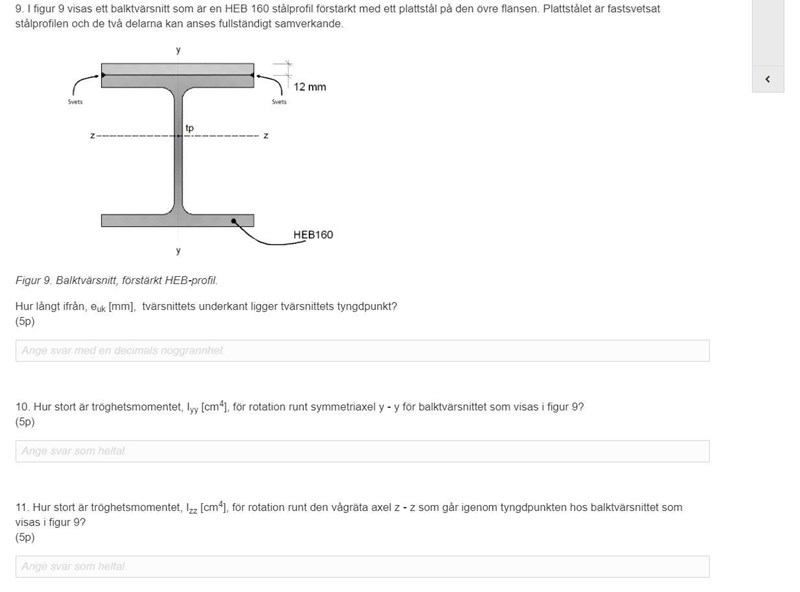 Stött på ett problem på fråga 9 hur ska man räkna ut en förstärkt profils tyngdpunkt. I detta fallet är det en HEB160 med en 12 mm tjock stålplåt förstärkning svetsad. Enligt formelboken är tyngdpunkten för HEB160 65,3 [mm] eftersom den är svetsad med en annan plåt måste jag inte beräkna om tyngdpunkten iså fall hur gör man. Sen är det väl att subtrahera längden med tyngdpunkten för att lösa fråga 9 väl.