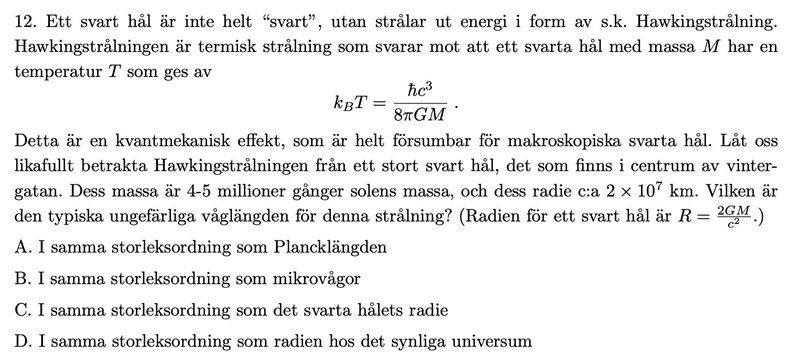 Det anges i uppgiften att ett svart hål strålar ut energi i form av Hawkingsstrålning som beskrivs med uttrycket. kBT är en energiuttryck (enheten för kB är J/K)
