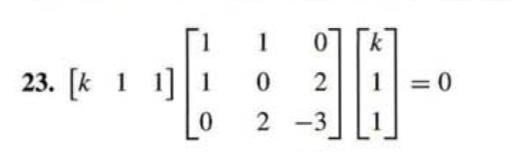Så multiplikation mellan de två vänstra matriserna ger situationen <1x3><3x1> som ska va lika med noll. Ger dig en ekvation i k som borde vara lösbar.