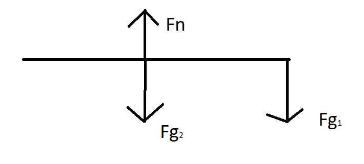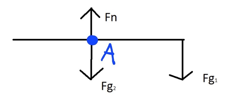 Det finns endast en kraft som bidrar till momentet runt punkt A. Denna kraft är Fg1 och den bidrar till ett moment medurs kring A. Det finns ingen kraft som bidrar till något moment moturs. Därför kan sugröret inte vara i balans. Troligtvis angriper inte både FN och Fg2 i samma punkt, se nedan.