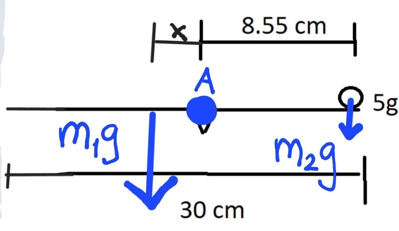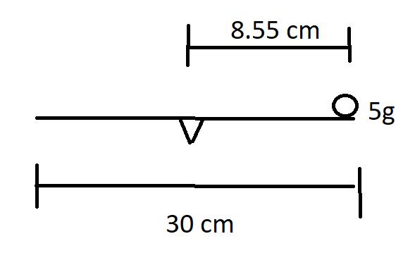 Det lycker ett sugrör och den är i balans. I kanten finns det en sten som väger 5g och den stor på en annan sten + Mellan första stenen och den andra stenen är den 0.855m Frilägg uppgiften