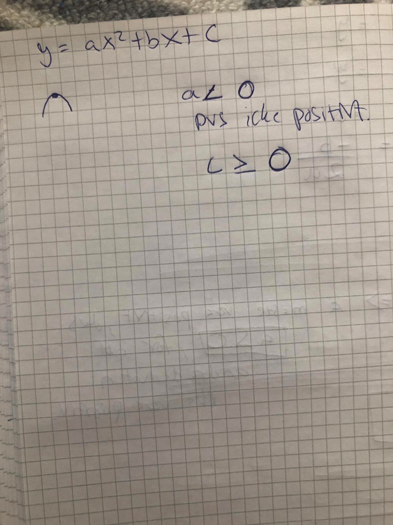 Andragradsfunktionen f(x) = ax^2 + bx + c har en maximipunkt på positiva x-axeln. Bestäm de villkor som måste gälla för koefficienterna a, b och c.