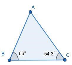 A+B+C = 180 A+54,3 + 66 = 180 A+120,3= 180 A= 180- 120= 59,7 A= 59,7.