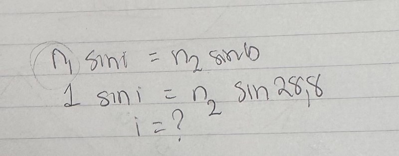 Jag menade att ljuset först stöter på ett gitter och som får ljuset att "böjas" (kan inte vad det heter). Direkt efter så bryts det i glaset via Snells lag som du ställt upp. Har du räknat med det?