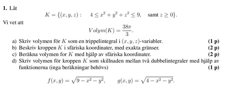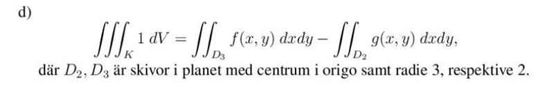Behöver hjälp med uppgift d. Förstår inte riktigt hur man ska gå tillväga för att lösa denna. Kan tyvärr inte ge någon ansats på en lösning. Jag vet att trippelintegralen av 1 är volymen. Samt att skillnaden mellan två dubbelintegraler blir en volym, då båda vanligtvis beskriver en volym. Första bilden är uppgiften, andra bilden är facit.