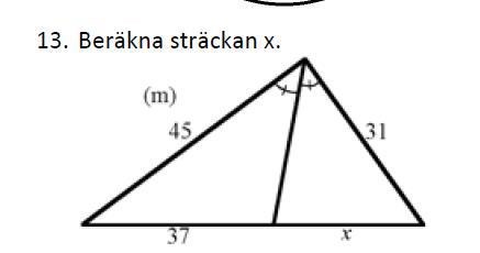 formeln är ju AD/BD=AC/BC då tänkte jag att AC=45, BC=31, AD=37 och BD=x. Sedan så la jag in värdena i ekvationen vilket blev: 37/x=45/31 och 45/31 blev 1,45 och sedan så flyttade jag över 37 till högra ledet och fick x=1,45*37 som blev 53,65. så alltså blev x 53,65. Problemet är ju att man kan se att x aldrig kan vara längre än 37.