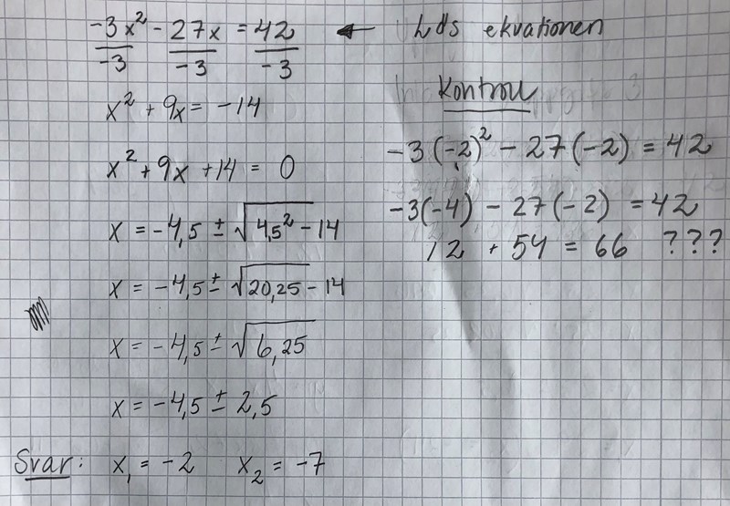 Jag behöver hjälp att hitta felet i min uträkning. Jag förstår att jag har gjort ett teckenfel någonstans men hittar det inte.