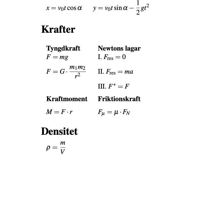 Hur ser det ut lite längre ner i vänsterspalten, under Tyngdkraft F = mg?