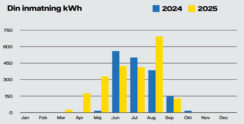 Jag har haft solceller utan batteri hittills men bestämde mig i år för att skaffa det. Med batteri förväntar man sig att både försäljningen och förbrukningen minskar drastiskt eftersom man utnyttjar mer av det solcellerna producerar istället för att sälja det. Detta är bra eftersom försäljningspriset är lägre än köppriset.