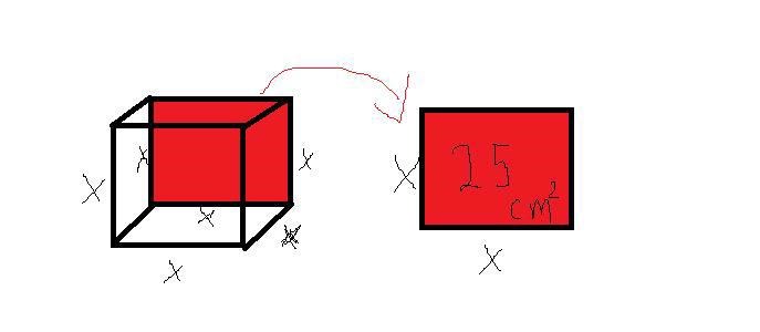 En sidoyta i en kub har arean 25 cm2. Beräkna kubens volym.