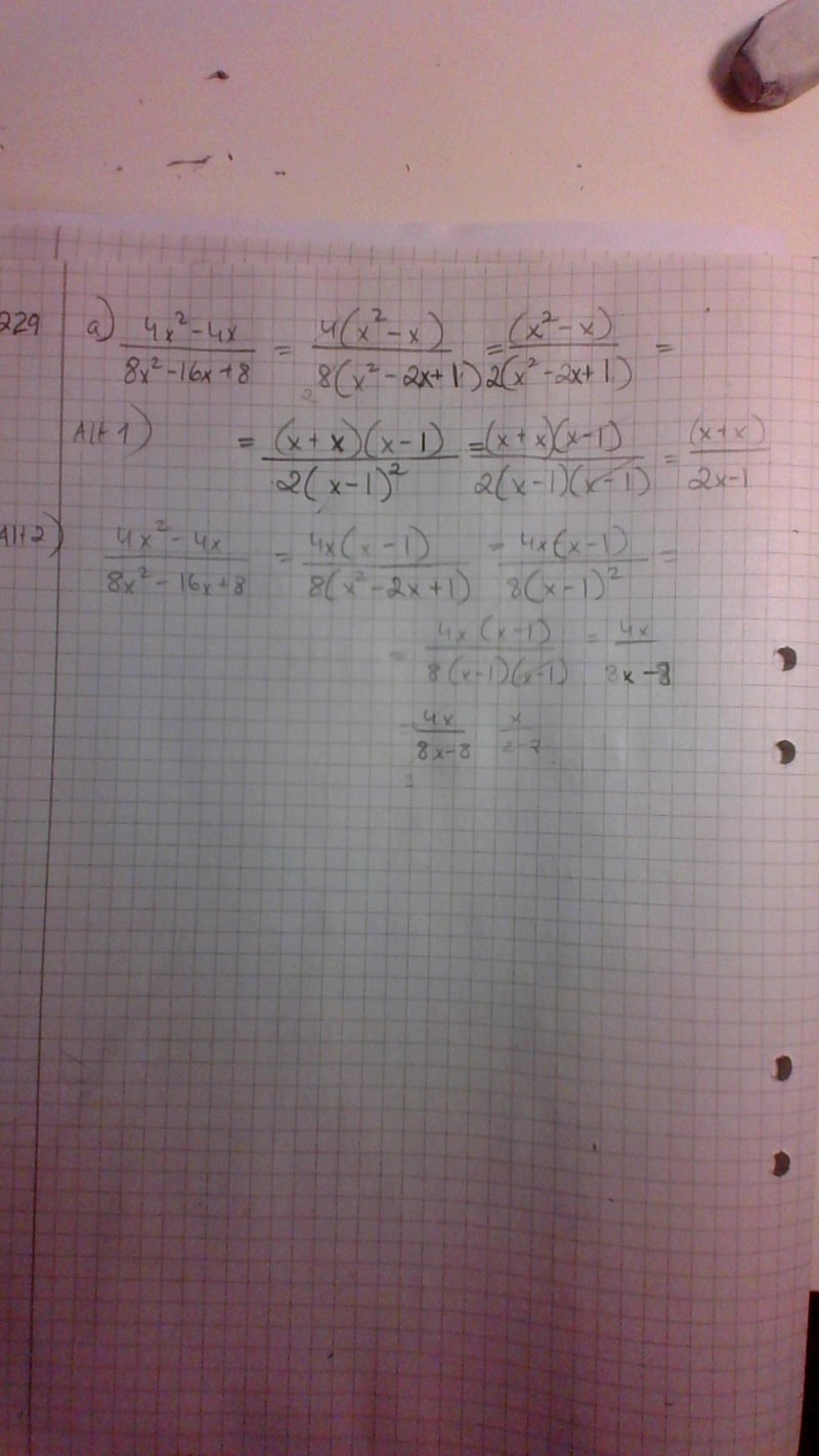 I första faktoriserar du x2-x fel. I andra tror jag felet är på sista raden men går inte riktigt se vad det står