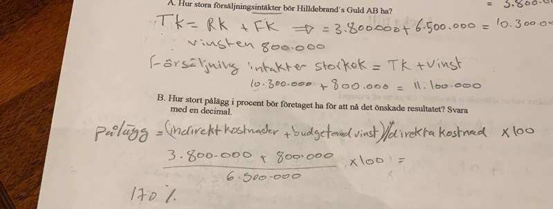 Hilldebrand´s Guld AB har budgeterat följande kostnader för det kommande året. Varuinköp 6.500.000:-, löner 1.600.000:-, och övriga rörelsekostnader för 2.200.000:-. Dessutom behöver företaget en vinst på 800.000:- för att framtiden ska kännas säker.