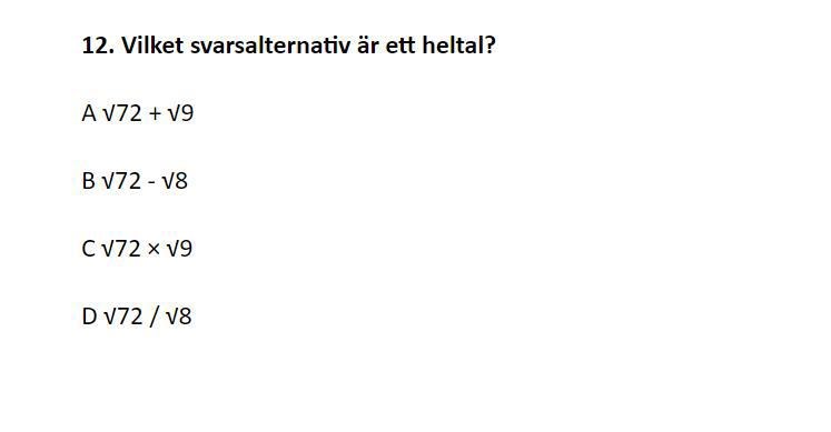 Anonymous75 skrev:Prova att räkna ut talen och se vilket som blir ett heltal. Ett tips är att testa multiplikationen och divisionen först.