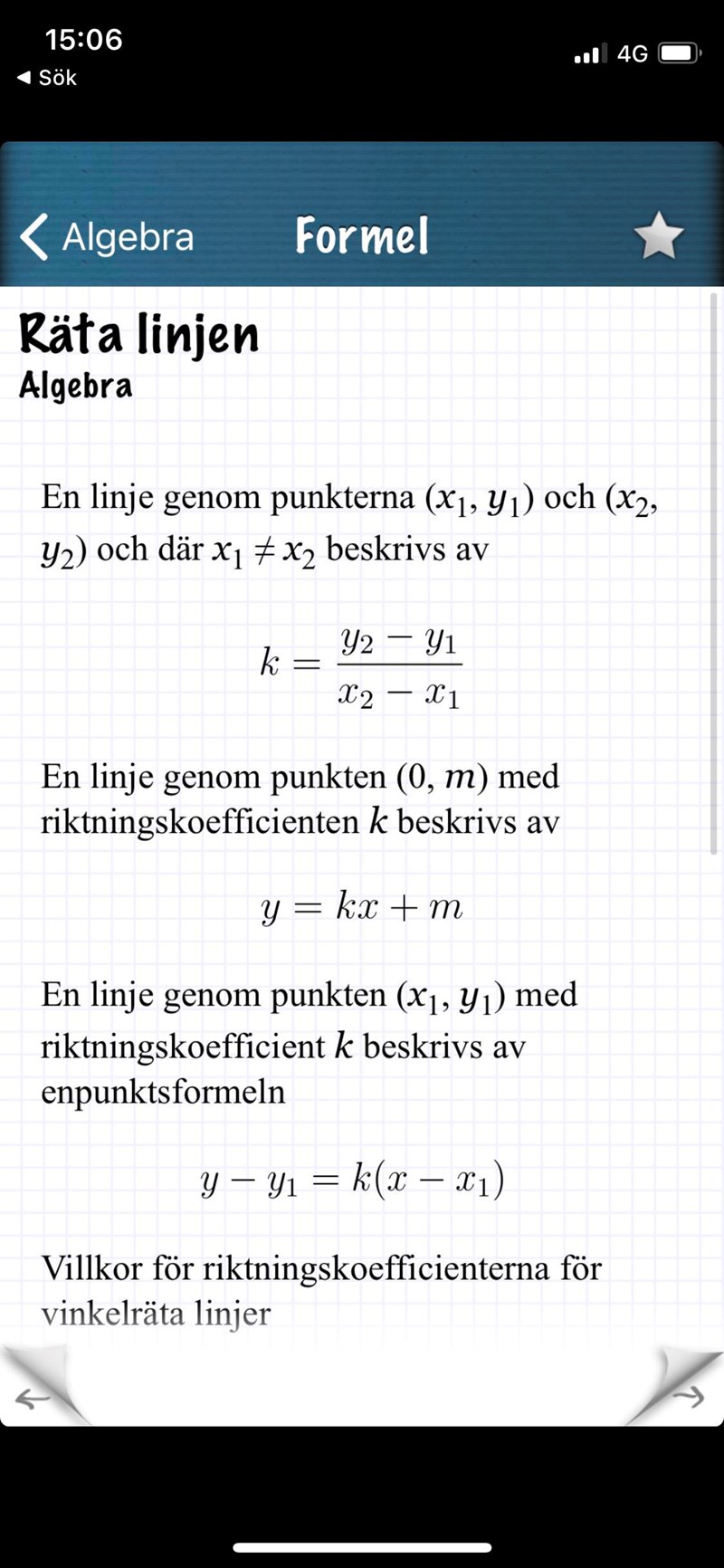 Smaragdalena skrev:Vilken uppgift är det du behäver hjälp med? Om vi börjar med att titta på uppgift 2042 a, så ser ud att linjen korsar y-axeln i punkten (0,2). Det betyder att konstanten m i räta linjens ekvation y = kx+m har värdet 2. Titta sedan på själva linjen! Om du börjar i punkten (0,2) och går ett steg åt höger, så ser du att linjen har höjt sig en liten bit - mindre än ½ ruta. Om du går 3 steg åt höger ser du att linjen har höjt sig 1 steg. Det betyder att riktningskoefficienten k har värdet 1/3, så räta linjens ekvation är . Kan du lösa de andra uppgifterna på motsvarande sätt?