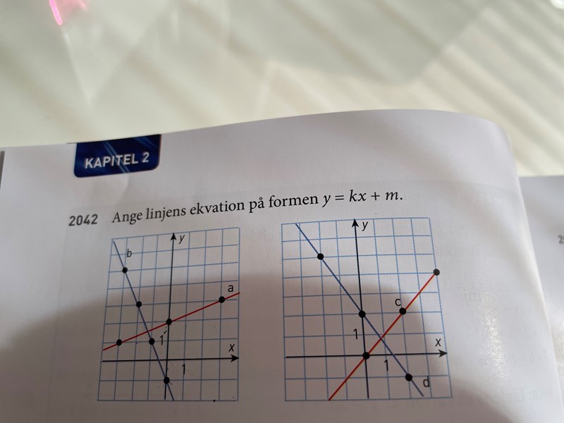 Vilken uppgift är det du behäver hjälp med? Om vi börjar med att titta på uppgift 2042 a, så ser ud att linjen korsar y-axeln i punkten (0,2). Det betyder att konstanten m i räta linjens ekvation y = kx+m har värdet 2. Titta sedan på själva linjen! Om du börjar i punkten (0,2) och går ett steg åt höger, så ser du att linjen har höjt sig en liten bit - mindre än ½ ruta. Om du går 3 steg åt höger ser du att linjen har höjt sig 1 steg. Det betyder att riktningskoefficienten k har värdet 1/3, så räta linjens ekvation är . Kan du lösa de andra uppgifterna på motsvarande sätt?