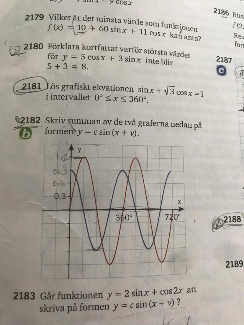 har en matteuppgift som jag helt enkelt fastnat på. Jag förstår inte hur man ska ta sig fram, kan lätt räkna om det skulle finnas cosx samt sinx men tror man ska titta på grafen och se. Bild på uppgiften (2182) kommer nedan.