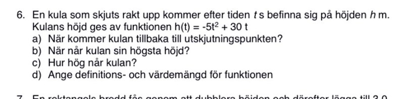Nu kanske jag är helt trög. Men om jag då tar 0=-5t^2+30t ? Hur gör jag då för att få fram tiden ?