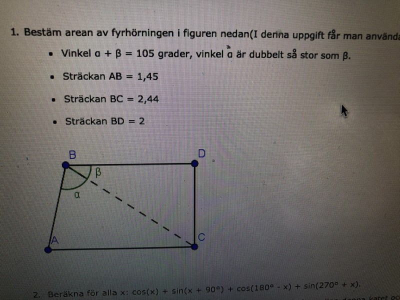 Jag försöker lösa denna uppgift men jag sitter fast! Jag funderar på att dela upp fyrhörningen i 2 trianglar. Jag tänkte använda mig av dessa formler : hc= c*sinAb*c*sinA2Den andra triangeln: b*h2