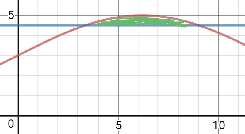 Rita en figur som visar vattendjupet som funktion av tiden t. Den bör se ut ungefär så här. Röd graf = vattendjup. Blå graf = 4,5 meter. Grönt område = tillräckligt stort vattendjup. Du ska ta reda på hur länge det är "grönt".