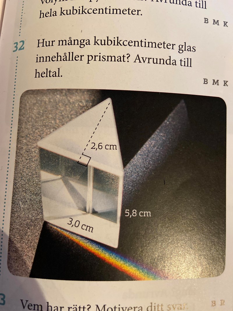 Svar: Prismat innehåller ungefär 23 kubikcentimeter glas.
