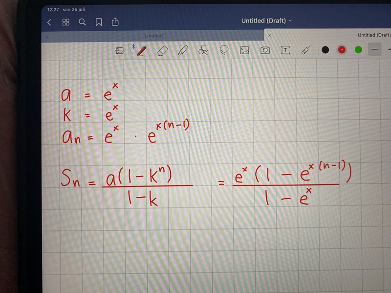 Så om jag struntar i att bryta ut e^x, så blir a = e^x och k=e^x vilket skulle betyda att an= e^x • e^(x(n-1)) ? Och det skulle medföra Sn = det som är på bilden. Eller ?
